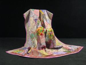 Handgearbeitete Patchworkdecke, Indien, Stickereien, Seide/Baumwolle/Zierperlen/Pailletten, in pastellfarben gehaltene Decke, dekoriert mit Blüten auf verschiedenfarbigem Grund, Rückseite rosafarben, 220x270 cm.