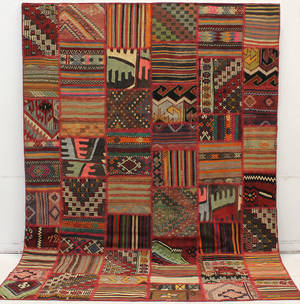 Matta, Kelim patchwork, handsydd. 300 x 215. Carpet patchwork, handsydd 345x250. Tillverkad av äldre/antika anatoliska fragment från kelimer i polykroma växtfärger. Lapptäcksteknik. Bomullsfodral på baksidan. Läs mer...
