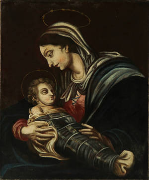 Ubekendt maler 1700-tallet. Madonna med barn. Olie på lærred, rentoileret. Usigneret. 79 x 66 cm. Uindrammet. Fremstår med krakelleringer og retoucher.