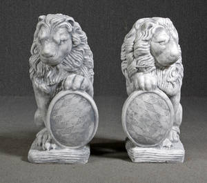Haveskulpturer af frostsikret støbt stenmateriale i form af par løver. Vægt ca. 88 kg pr. stk. H. 68 cm. (2)