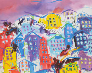 Thor Hansen. Komposition med huse. Akryl på lærred. Sign. og dateret Thor 2012. 80x100 cm. U.R.