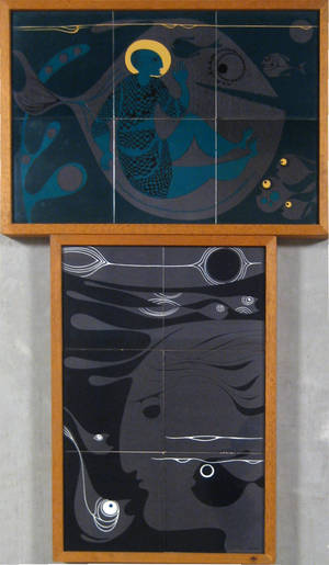 Lars Thirslund. To keramiske flisebilleder med hhv. fire fliser og én flise dekoreret i polykrom glasur i form af havfrue og fugl, sign. Jens Thirslund Läs mer...