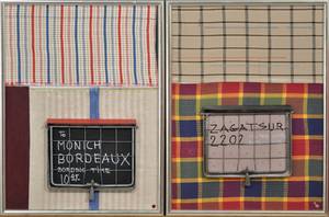 Erik Robert Hansen. Kompositioner, mixed media opklæbet på plade, usign., 84 x 64 cm inkl. ramme. (2) Denne vare er en del af temaauktionen over effekter hidrørende fra boet efter Erik Robert Hansen, tidligere indehaver af Hansens værtshus i Odense. Byd på samlerobjekter, franske industrilamper, emalieskilte, reklamegenstande, kunst , vin og møbler.