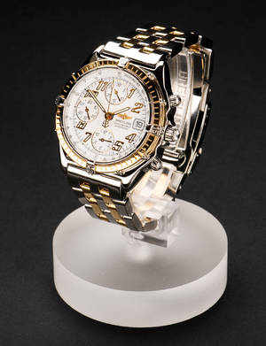 Breitling Chronograph Automatic herreur af rustfrit stål & guld. Hvid urskive med arabertal, stregindeks, separat sekund, datorude ved 3 position, chronograph funktioner, safirglas m.m. Urværk Läs mer...