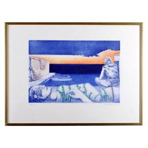 Surrealistisk komposition med figurer mot horisont. Signerad och daterad 87/260. 35.5x51.5 (59x78) cm.