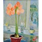 Blomstilleben framför fönster. Signerad och daterad 1949. 50x60 (53x62) cm.