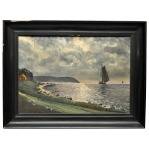 Olja på duk. Kustmotiv med segelbåtar under sol spruckna moln. 63x44 (76x57).