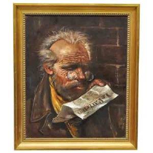 Olja på duk. Motiv av man med glasögon mot tegelvägg hållandes tidning. Signerad och daterad i Paris (19)-69. Slitage, krackelerad duk. 46x38 (53.5x45.5).