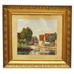 Akvarell. Motiv av svanar vid strandkanten i bymiljö. 21.5x23.5 (37.5x41).