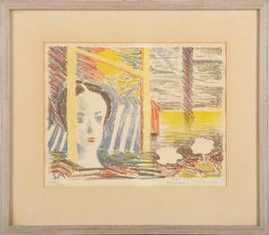 MÖRNER, Stellan (1896-1979): Komposition med kvinnoansikte, signerad Stellan Mörner, 156/200, färglitografi, 19x25 cm. Gulnad.
