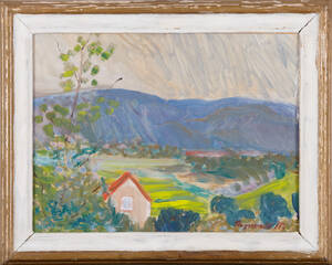 MAGNUSSON, Ragnvald (1904-1984): Hus i landskap, signerad Ragnvald M, olja på pannå, 35x46 cm. 128632.