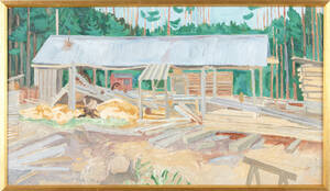 SKÖLD, Otte (1894-1958): "Sågverk", stämpelmärkt a tergo, olja på pannå, 56x100 cm. Krackeleringar.