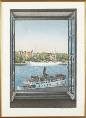 LJUNGGREN, Reinhold (1920-2006): Fönster mot Skeppsholmen, signerad R. Ljunggren, färglitografi, numrerad 205/310, 56x46 cm. 139529.