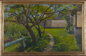 ROOSVAL KALLSTENIUS, Gerda (1864-1939): Trädgårdsvy, signerad och daterad Gerda Roosval Kallstenius 89, olja på duk, ca 59x100 cm. Tryckmärken, ytskador, obetydligt dukhål. Läs mer...