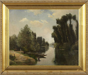 OIDENTIFIERAD KONSTNÄR: Flodlandskap, otydligt signerad, olja på duk, 38x46 cm. 149283.
