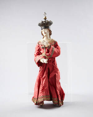RELIGIÖS SKULPTUR, med krona i silver, möjligen låghaltigt, 17/1800-tal, höjd 36 cm. Skulpturen med skador och färgbortfall.