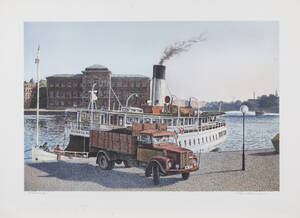 LJUNGGREN, Reinhold (1920-2006): Blidösund med utsikt mot Nationalmuseum, signerad R. Ljunggren, färglitografi, 26/360, 35x52 cm, oramad. 190818.