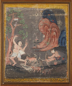 MÅLNING på textil, Thailand, dramatisk figurscen, 58x48 cm. Skador, hål,blekt, färgbortfall.