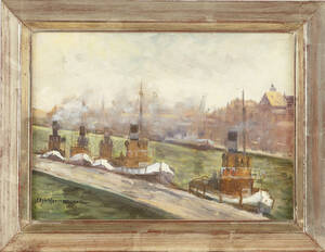 HERMANSSON, Else (1900-1997): Hamnbild, signerad Else Hermansson, olja på pannå, 16x22 cm. 161351.