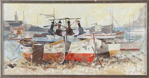 ARKEL, Adrian van (född 1924): Fiskeläge, Spanien, signerad V Arkel, olja på duk, 29x59,5 cm. 161265.