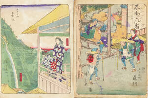 HIROSHIGE II (1826-1869), 2 st: Motiv med resenärer samt motiv med kurtisaner, 22x17 cm vardera, oramade. Fläckar, lagningar.