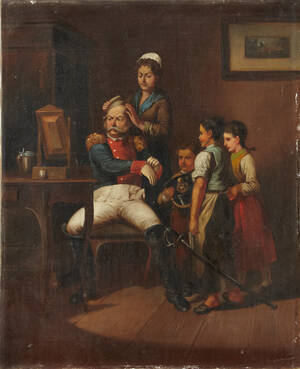OIDENTIFIERAD KONSTNÄR (1800-tal): Familjescen i interiör, olja på duk, 68x56 cm. Oramad, färgbortfall längs kanter, smärre krackelyr.