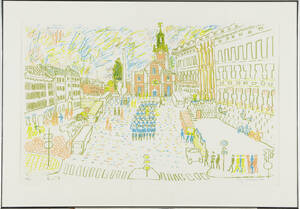 CLAESSON, Stig (Slas), (1928-2008): Vy mot Storkyrkan i Stockholm, signerad och daterad Stig Claesson -80, färglitografi, 24/60, 55x87 cm. 177497.