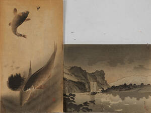 KOSON, Ohara (1877-1945) 2 st: Landskap med flod och båt resp Fiskar, signerade Koson med eget sigill, tanzaku 34,5x19 cm vardera, Proveniens:Auktionsverket 1983, 1981, oramade. Fläckar, veck, revor, gulnade.