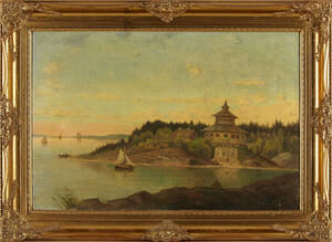 Oljemålning med fort och segelbåtar