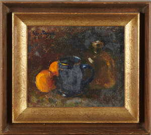 BAGGE, Eva (1871-1964): "Blå mugg och apelsiner", signerad och daterad Eva Bagge -58, olja på pannå, 23x26 cm. 169844.