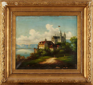 OIDENTIFIERAD KONSTNÄR: Slott i centraleuropeiskt landskap, olja på duk, 55x66 cm . Färgbortfall, dukskador, lagningar .