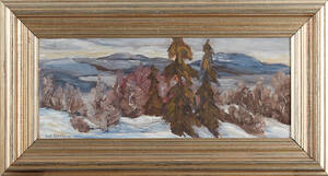 ERIK OSSLUND (1913-1982): "När det våras ibland fjällen", signerad och daterad Erik Osslund 1948, olja på pannå, ca 37,5x46 cm. Hål längs kanterna. Läs mer...