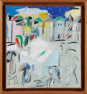 PYK, Madeleine (född 1934): Sydländskt motiv med figurer, signerad M. Pyk, olja på duk, 34x31 cm. 209832.