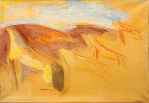 Bertil Öhlund (1923-2003), oljemålning på duk. Signerad och daterad -63. "Les lions de delos". 138 x 97 cm. Detta verk ingår som en del av kvarlåtenskapen efter konstnärsparet Bertil Öhlund och Yvonne Antoniou-Öhlund. Verket har hittills endast varit i familjens ägo och är därför inte belagt med BUS. JH Transport erbjuder transport av denna vara till en kostnad av DKK 300 + dansk moms till JH's lager i Odense eller Ishöj, Danmark.