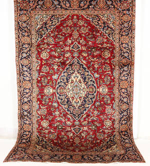 Handknuten matta från Kashanområdet i centrala Iran. Tätknuten matta med rikt mönster av blommor och palmetter runt linsformad medaljong på röd botten. Kashan, ull på bomullsvarp. Storlek 302 x 195 cm.