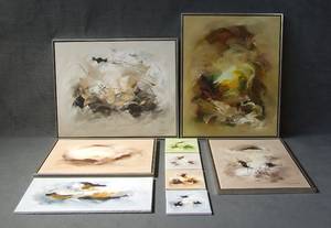 Unbekannte Künstler, 21. Jh.. 9 Bilder, abstrakte Kompositionen, Acryl auf Leinwand. H 26cm bis 102cm, B 26cm bis 102cm. (9) JH Transport kann diese Ware zum JH-Lager in Ishøj für dkr 300,- + MwSt. oder zu jeder Adresse in Dänemark zu dänischen Inlandspreisen transportieren.