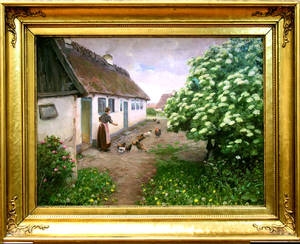 Sommermorgen. Hønsene fodres', olie på lærred. H. A. Brendekilde 1857-1942. Sign. H.A. Brendekilde. 43 x 57 cm. (59 x 73 cm).