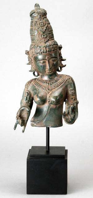 Skulptur i bronze forestillende Tara (buddhistisk gudinde) . Udført i patineret bronze og monteret på stand af sortlakeret træ. Højde 47 cm, bredde 16 cm.