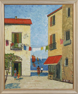 Ubekendt kunstner. Olie på lærred, sydlandsk bymotiv, usign. 77 x 63 (87 x 72) cm.