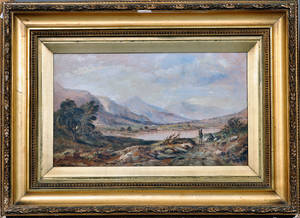 Ubekendt kunstner, Bjergrigt landskab med jægere, olie på træplade ( bag glas ) usigneret 23x39 cm. (42x57 cm. )