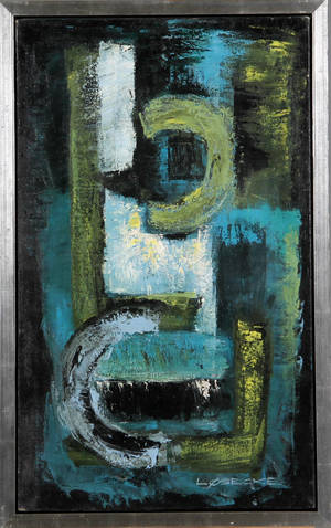 Emma Løsecke Nielsen. Abstrakt komposition. Olie på lærred. Sign. Løsecke. Mål: 100 x 60 (107 x 67) cm.