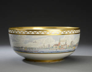 Kgl. Jubilæumsbowle af porcelæn fremstillet i anledning af fabrikens 200 års jubilæum i begrænset antal. Denne nr. 502/2500. Motivet på bowlen gengiver et indtryk af Københavns profil og sundkysten i 1975. H. 15 Ø 33 cm.
