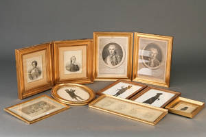 Samling stik og tryk i guldrammer 1800-1900 tallet. Silhouetterne samt tegning er reproduktion efter originalerne. Størrelse fra 18 x 15 cm op til 32 x 24 cm. Enkelte med skjolder.