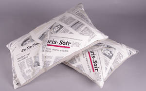 Två kuddar i tyg med motiv av tidningstryck. 40x60 cm. Visningsexemplar.