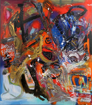 Lars 'Fantasiformidler' Elgidh født 1973. Mix media på lærred. Abstrakt komposition betitlet " Computer-Breakdown". Sign. Lars Elgidh 2013. Mål: 160 x 140 cm. Uindrammet. Læs kunstnerprofil her