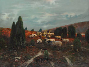 Får på mark af Fritz Grebe (1850-1924), olie på lærred, sign. F. Grebe, 26x39 cm. (36x49,5 cm). Läs mer...