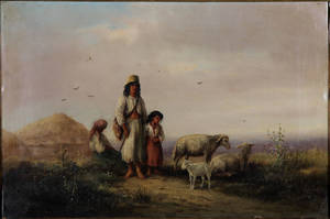Ubekendt kunstner. Bønder med får, olie på lærred. Utydeligt sign. 26 x 40 (39 x 52) cm. Se endvidere varenr. 2962549.