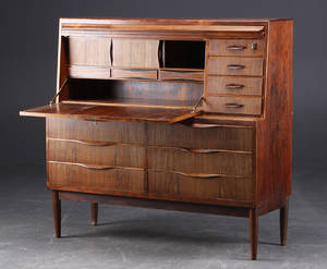 Erling Torvits. Chatol af palisander, front med skuffer samt nedfældig skriveklap bag hvilken hylder, skydelåger og rum; øverst to smalle skuffe med skjult åbne-mekanisme. Ben Läs mer...