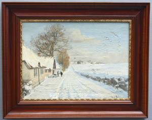 HANS ANDERSEN BRENDEKILDE (Danmark, 1857-1942): Vinterklätt bymotiv, signerad H A Brendekilde, olja på duk, ca 39x48 cm. Ram med skador. Läs mer...
