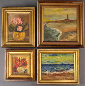 Ubekendt kunstner, olie på plade. Motiver fra Skagen bestående af motiv med Skagen fyr h. 21 x 21 cm (30 x 30 cm), Skagen Nordstrand 17 x 21 cm (22 x 26 cm) samt 2 små blomstermalerier af samme kunstner 18 x 14 cm (26 x 21 cm) og 12 x 11 cm (20 x 19 cm) 2 daterede 1967 0g 1968. Signerede.